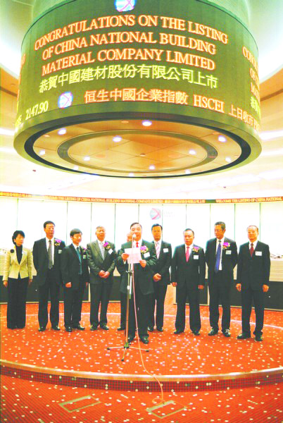 國家發(fā)改委、國資委、中國建材協(xié)會(huì )、中國水泥協(xié)會(huì )及相關(guān)政府部門(mén)領(lǐng)導、中國建材董事、監事、高管人員、股東單位代表、國內建材行業(yè)代表、金融業(yè)代表、證券機構代表、合作單位代表,以及香港社會(huì )各界人士代表參加了當天的上市掛牌儀式。