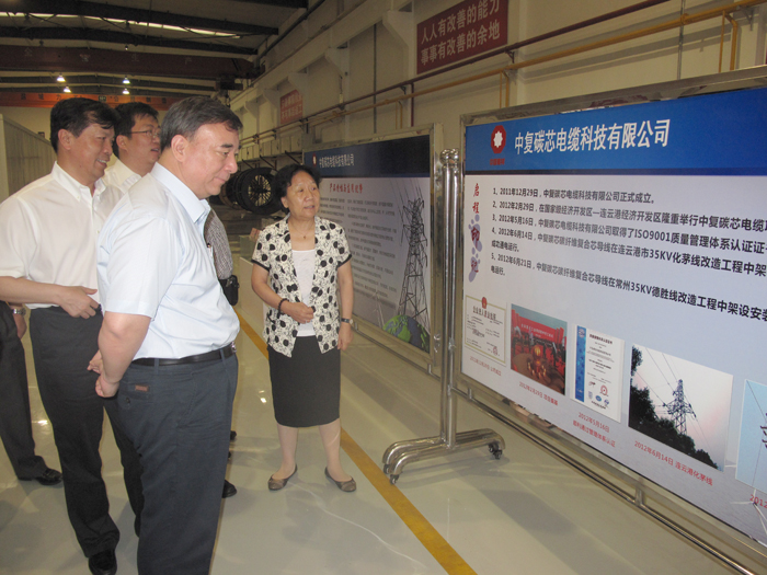 8日,宋志平董事長(cháng)一行冒雨視察了中復連眾碳芯電纜項目和葉片全尺寸檢測中心。在碳芯電纜試生產(chǎn)車(chē)間,中復連眾董事長(cháng)任桂芳向宋董事長(cháng)匯報了碳芯電纜項目的進(jìn)展情況。碳芯電纜具有耐高溫、熱膨脹系數小、耐腐蝕、輸送容量大、線(xiàn)損小等一系列優(yōu)異性能,是傳統鋼芯鋁絞電纜的更新?lián)Q代產(chǎn)品,具有很強的經(jīng)濟效益和社會(huì )效益。作為中復連眾今年重點(diǎn)建設項目,碳芯電纜項目已于2月29日奠基,目前各項工作都在緊張有序進(jìn)行,今年年底一期工程建成投產(chǎn),預計完全達產(chǎn)后年產(chǎn)復合材料電纜芯及電纜20000千米。試生產(chǎn)已經(jīng)取得階段性勝利,6月14日和21日,分別在連云港化茅線(xiàn)改造工程和常州市德勝線(xiàn)改造工程中架線(xiàn)安裝,并于當日通電運行。